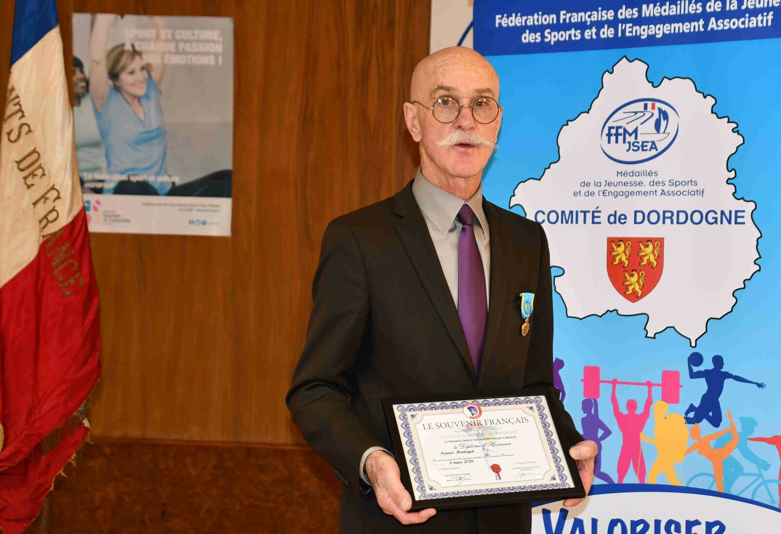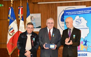 Pour son action au sein du CDMJSEA 24 en sa qualité de membre du CODIR et responsable du cercle de Bergerac , M. Frédéric GONTIER a reçu la plaquette fédérale Or de la Jeunesse des Sports et de l'Engagement Associatif des mains du président du CDMJSEA 24 accompagné par M. Daniel ANNE président général des Enfants de France de Bergerac et