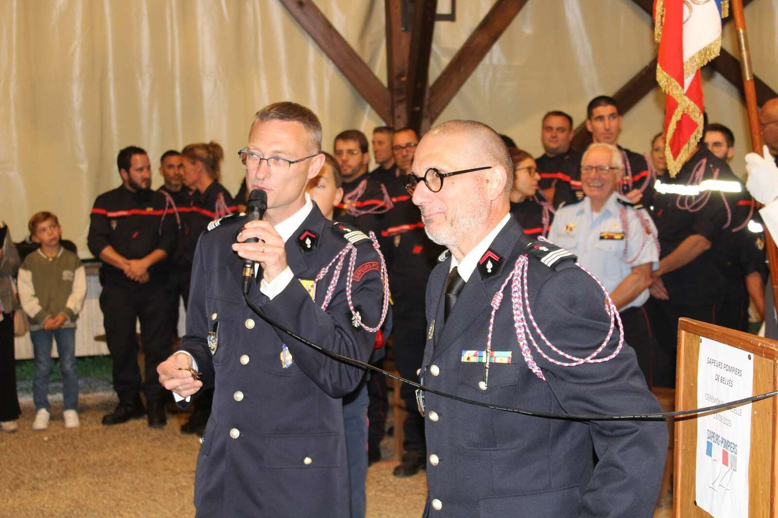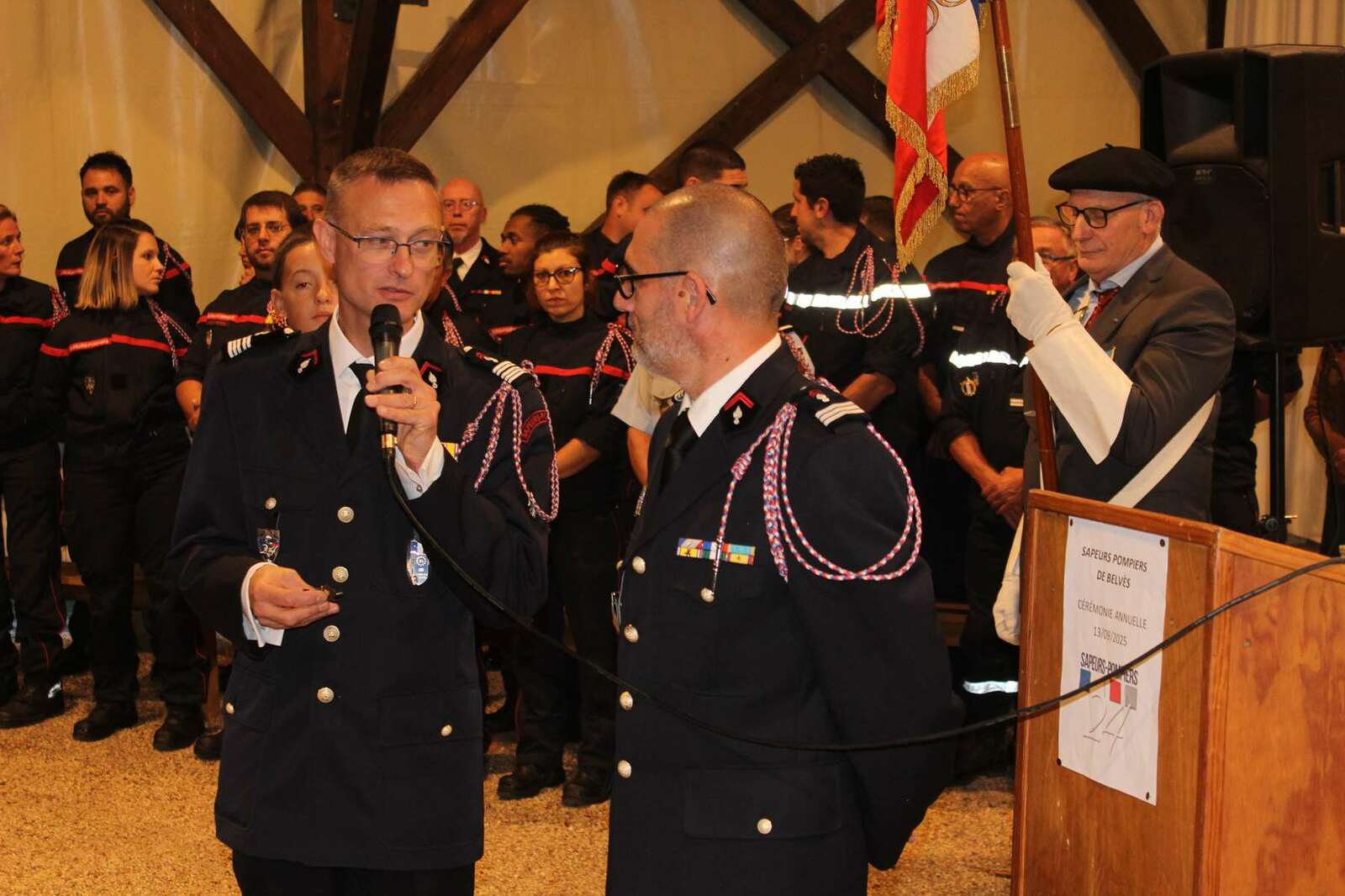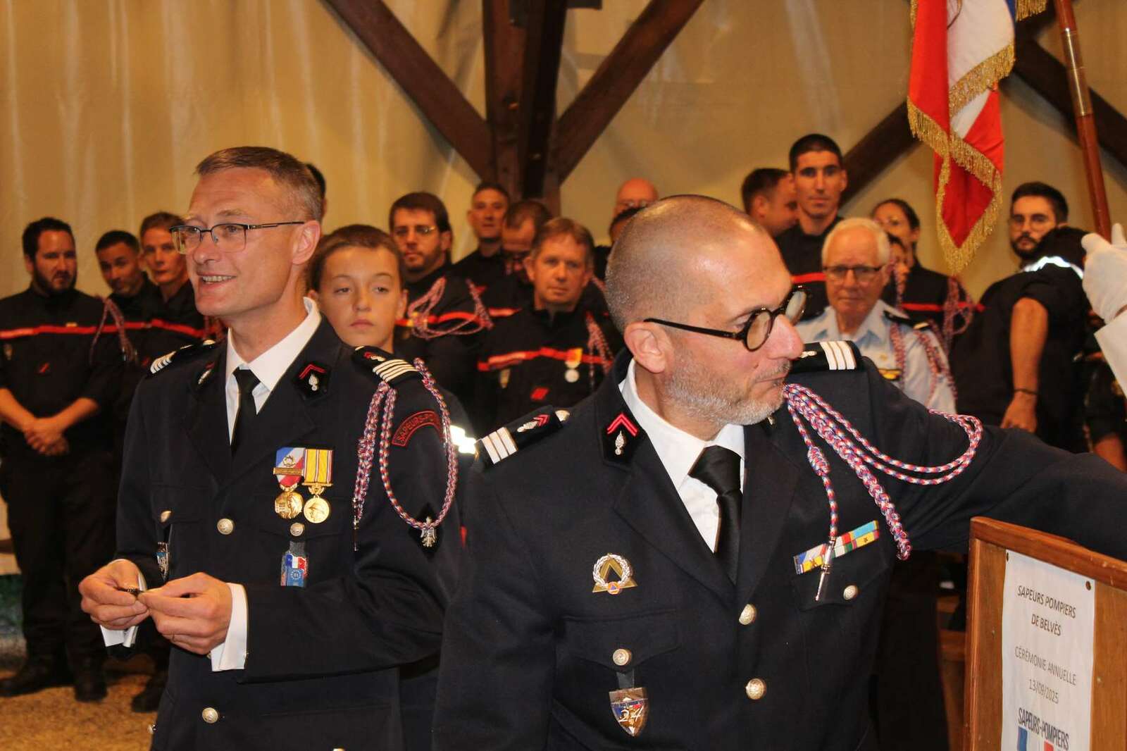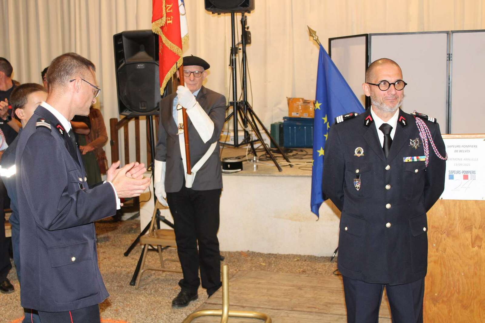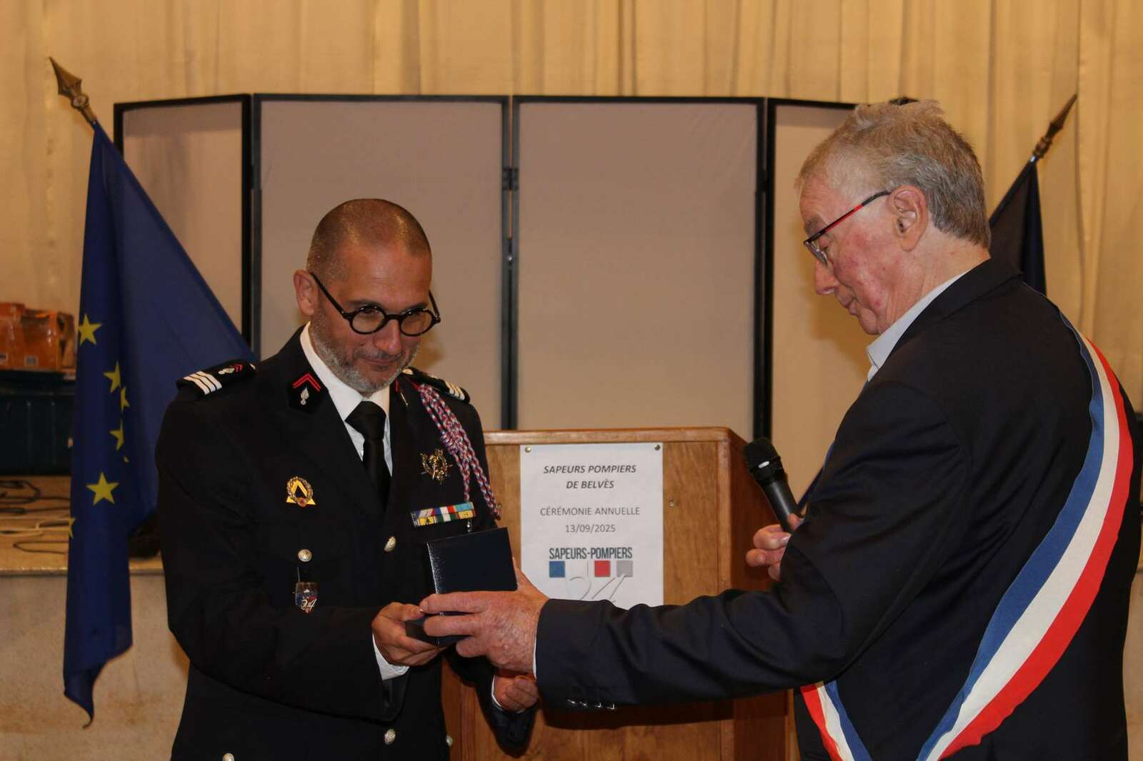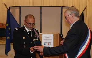 Après les interventions des personnalités, une remise de médailles et de galons de sapeurs-pompiers, une médaille de la jeunesse des sports et de l'engagement associatif échelon bronze a été attribuée au capitaine (ER) Guy FERBER et le capitaine (ER) Michel DUMAS en présence de Monsieur Christian LEOTHIER maire de Pays de Belvès, de Monsieur Benoit SECRESTAT vice-président du conseil départemental représentant Monsieur Germinal PEIRO, de Monsieur le Colonel Thierry HIERHOLTZ Directeur adjoint du SDIS - Chef de corps adjoint de la Dordogne représentant Monsieur le contrôleur général RIVIERE et d'une nombreuse assistance.