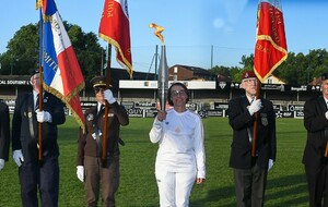 4 - Cinq drapeaux (dont celui de la jeunesse et des sports et de l'engagement associatif) accompagnent la flamme olympique jusqu’au milieu du terrain de rugby.