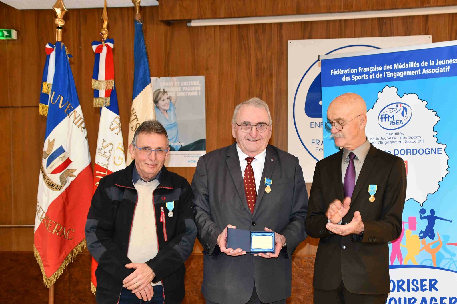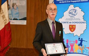 Pour son action au sein du CDMJSEA 24 en sa qualité de membre du CODIR et responsable du cercle de Bergerac , M. Frédéric GONTIER a reçu la plaquette fédérale Or de la Jeunesse des Sports et de l'Engagement Associatif des mains du président du CDMJSEA 24 accompagné par M. Daniel ANNE président général des Enfants de France de Bergerac et