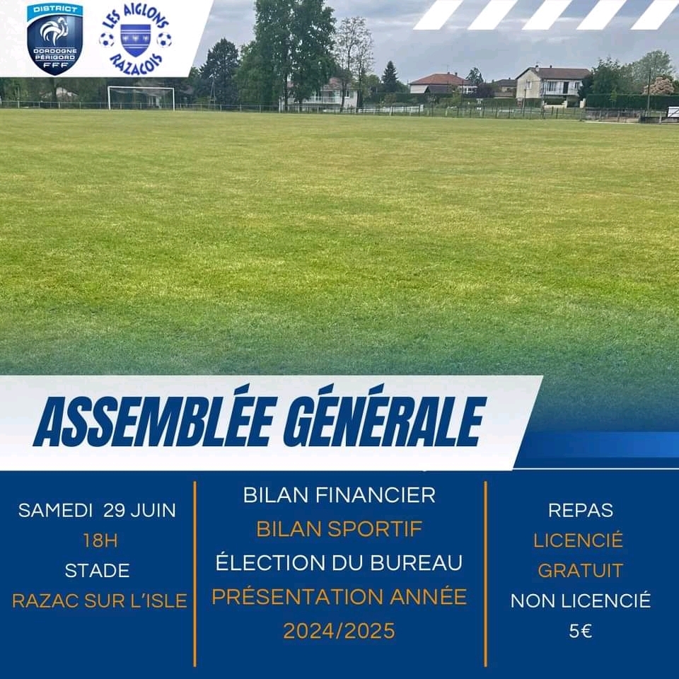 Le club de football de Razac sur l'Isle a l'honneur de vous convier à son assemblée générale le samedi 29 juin 2024 a 18h au complexe sportif de Bosbarreau.