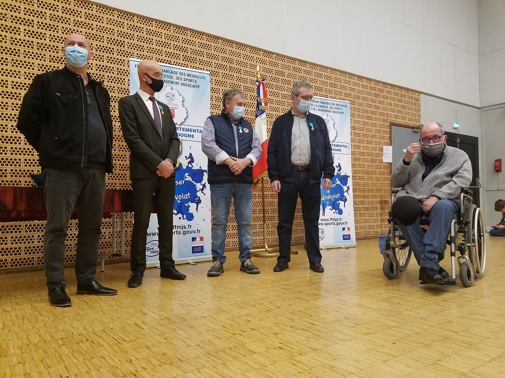 Le mercredi 17 février 2021, le président du Comité départemental de la Jeunesse, des Sports et de l’Engagement Associatif a décoré deux bénévoles associatifs locaux bien connus des Boulazacois. Francis MONTAGUT a ainsi remis par arrêté de Monsieur Frédéric PERISSAT Préfet de la Dordogne au titre de la promotion du 14 juillet 2020 la médaille de bronze à Francis DESAGE et Pascal FURELAUD. Le premier récipiendaire est président des Amis de Barnabé, le second dirigeant du club de football d’Atur. Cette distinction vient honorer le parcours de ces deux figures locales qui ne ménagent pas leur énergie au service de leurs adhérents et du dynamisme de la commune. Le Maire Jacques AUZOU et Serge RAYNAUD adjoint en charge des Sports, ont chaleureusement félicité les deux médaillés et salué « leurs actions, leur dévouement bénévole, au service du bien vivre ensemble de notre commune ».